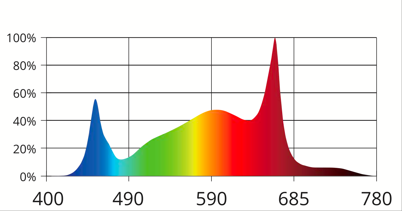 Das abgestimmte Spektrum der LumiFlora Fold 720 W kombiniert warmweißes, kühles und tiefrotes Licht (3500 K + 660 nm + 730 nm IR).