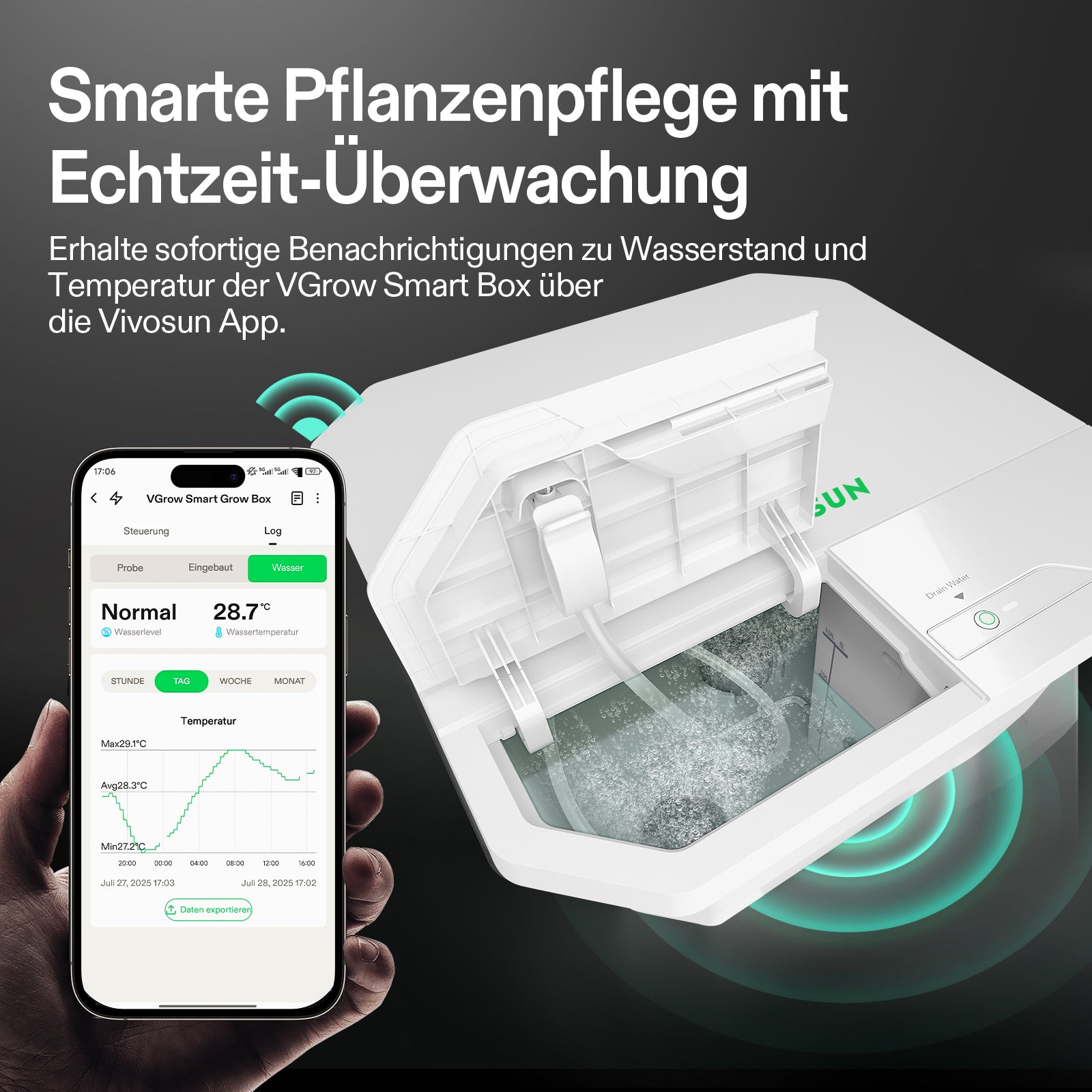 Überwachen: Wasserstand und pH-/EC-Werte regelmäßig prüfen.